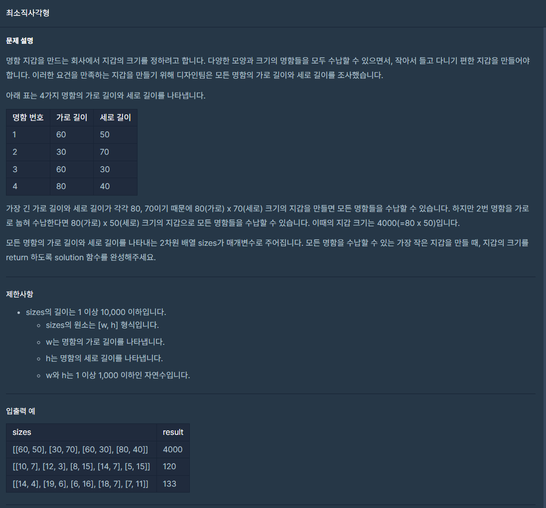 결국, 최소 직사각형을 구하면 한쪽에 max값을 두고 다른쪽에 나머지를 두는 것이 가장 작다.